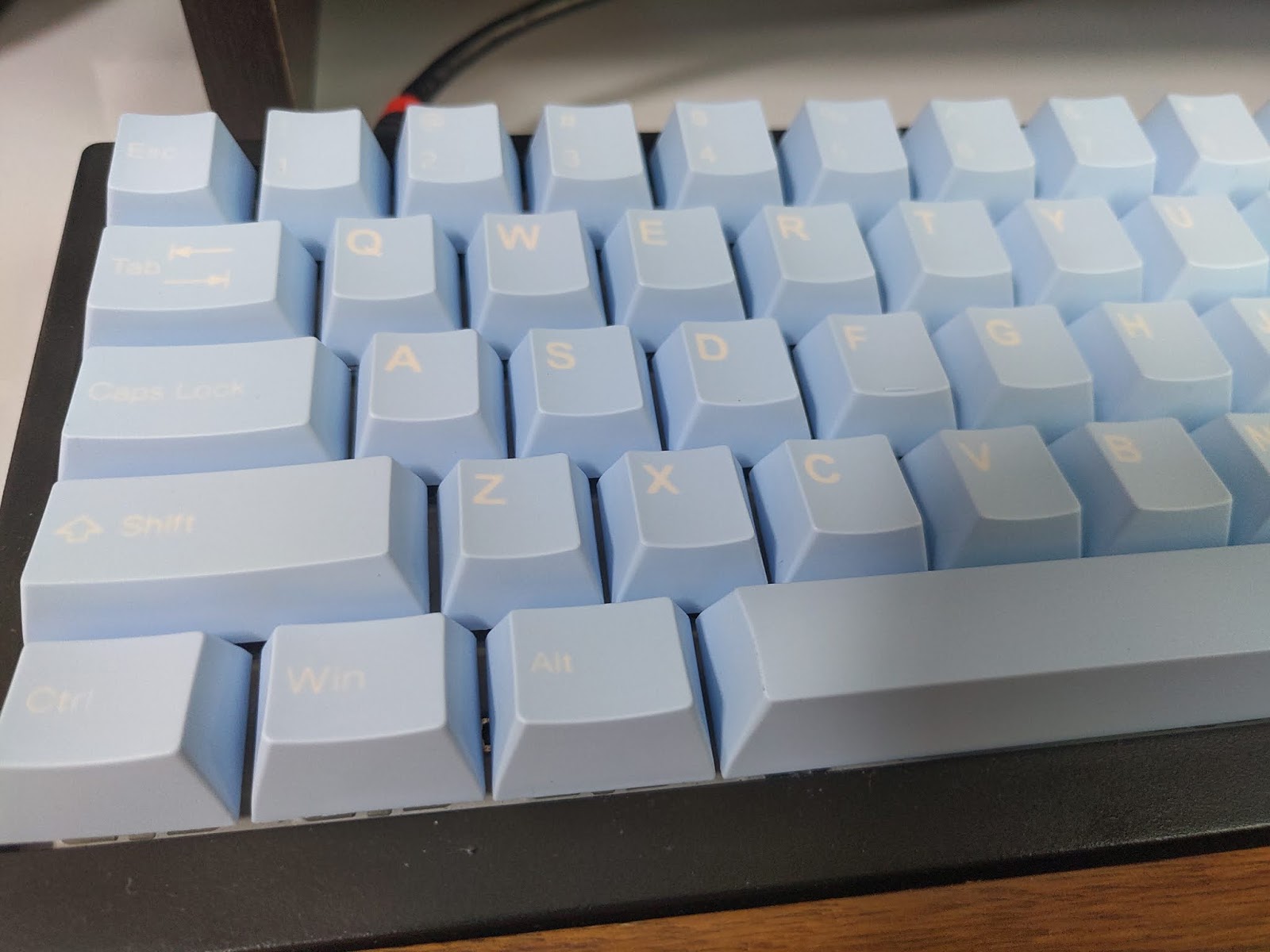 太豪冰湖是Cubic Profile的單色配色鍵帽,先從Profile說起,這種Profile的鍵帽在高度上跟OEM差不多,表面處理較有磨砂感,手指摩擦表面時的觸感不錯。在高度上,這款鍵盤的打感接近ABS的OEM鍵帽,不過因為有不錯的表面處理,因此打感會較一般的雷雕上漆鍵帽好上不少,加上鍵帽邊緣方正銳利,印字較粗,因此視覺上比一般OEM鍵帽更加好看。