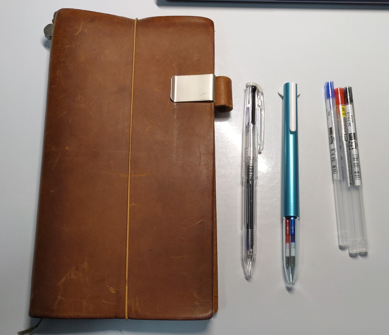 我自己本身是旅人筆記本(Traveler's Notebook)愛用者,主要是一本筆記本內可以夾2-3本小筆記本很方便,不僅一本寫完可以馬上替換到另外一本,各式配件也可以拿來收藏各式小文件(如發票、票根等)或墊板等。在TN眾多配件中,有個配件並不是很多人喜歡,不過我持續使用至今,就是TN的筆插。話說這筆插也要三百多,不過只能固定在封面且容易滑動,所以我可以想像許多人認為他不是很好用。不過,畢竟有筆插還是方便許多,至少我就可以帶一支筆,當手頭臨時忘記帶筆袋,或者出去旅遊兩三天但想做簡單記錄時,一本一筆的攜帶總是方便一些。